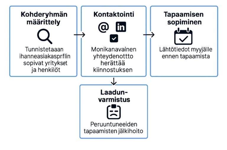 Harvard Business Review on todennut, että B2B-ostajat eivät useimmiten etene ostopäätökseen ilman aktiivista myyntikeskustelua. Tämän vuoksi systemaattinen tapaamisten buukkaus on keskeinen osa toimivaa uusasiakashankintaa.
